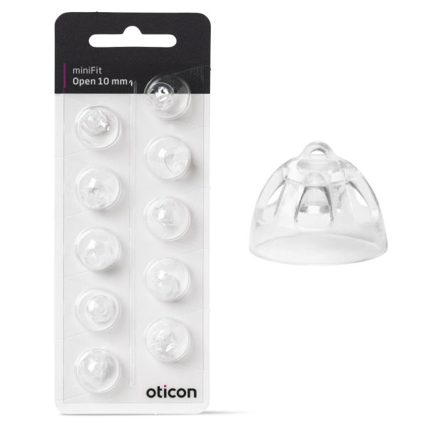The Oticon miniFit Open 10 mm domes are made of soft, skin-friendly material that adapts to your ears. There are 3 different versions of miniFit domes that you can easily switch between. Here, the open version is shown, which provides the least amount of occlusion in the ear canal but also gives less dynamic in the amplified sound.