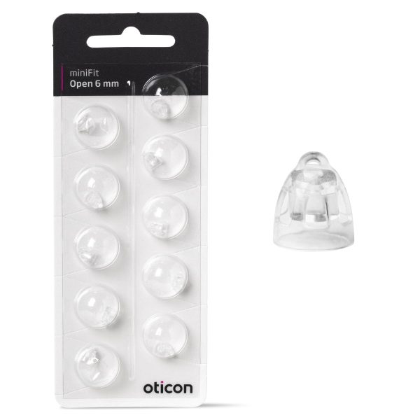 The Oticon miniFit Open 6 mm domes are made of soft, skin-friendly material that adapts to your ears. There are 3 different versions of miniFit domes that you can easily switch between. Here, the open version is shown, which provides the least amount of occlusion in the ear canal but also gives less dynamic in the amplified sound.