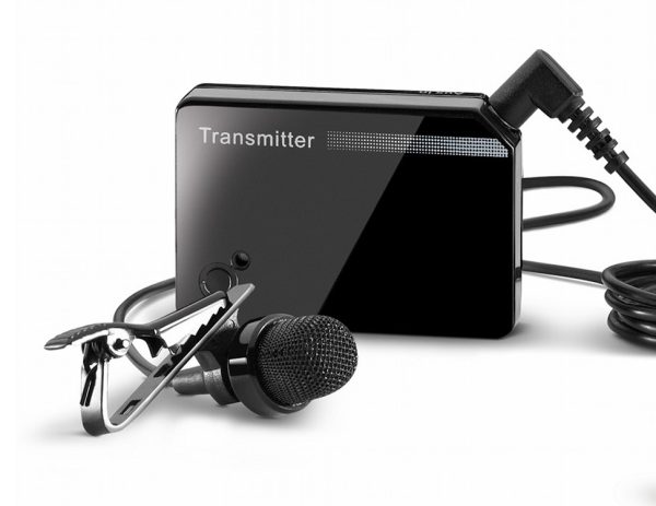 - Includes a microphone that sends sound to your hearing aids through the transmitter.