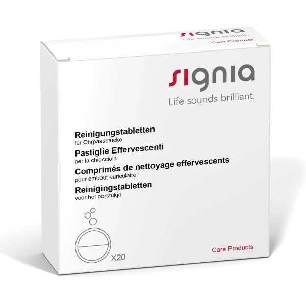 For the cleaning of your domes, you have the option to bathe them either daily or weekly. Simply dissolve the tablets in water and soak the domes for at least 15 minutes. Before using them, ensure thorough drying and proper clearance of the sound tubes. Utilizing the Signia Air Blower can easily help achieve this.